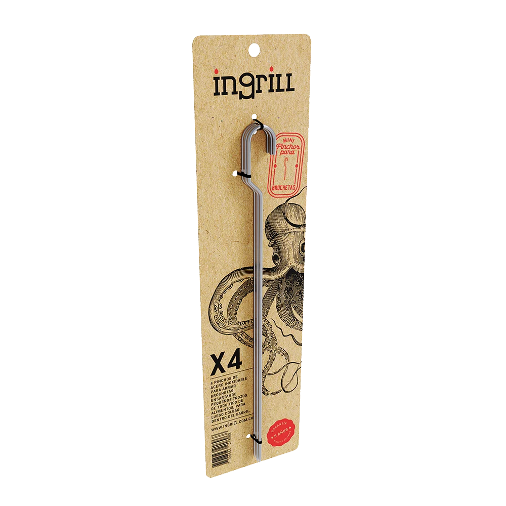 Accesorio para barril ahumador asador de acero inoxidable 304. Este kit de pinchos para brochetas en acero inoxidable viene x 4 unidades y es muy útil para preparar jugosas brochetas de pollo, carne, camarones, verduras y todo lo que puedas imaginar. Su diseño es exclusivo e ideal para el tamaño de barril ahumador asador MINI.