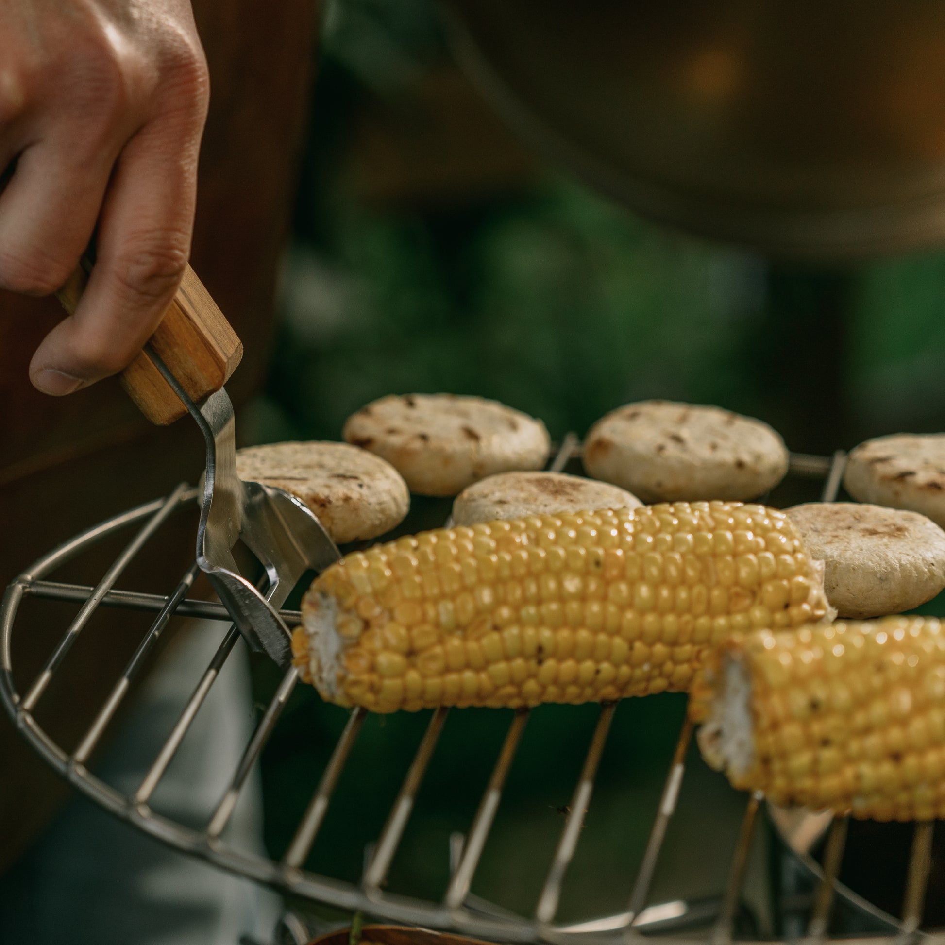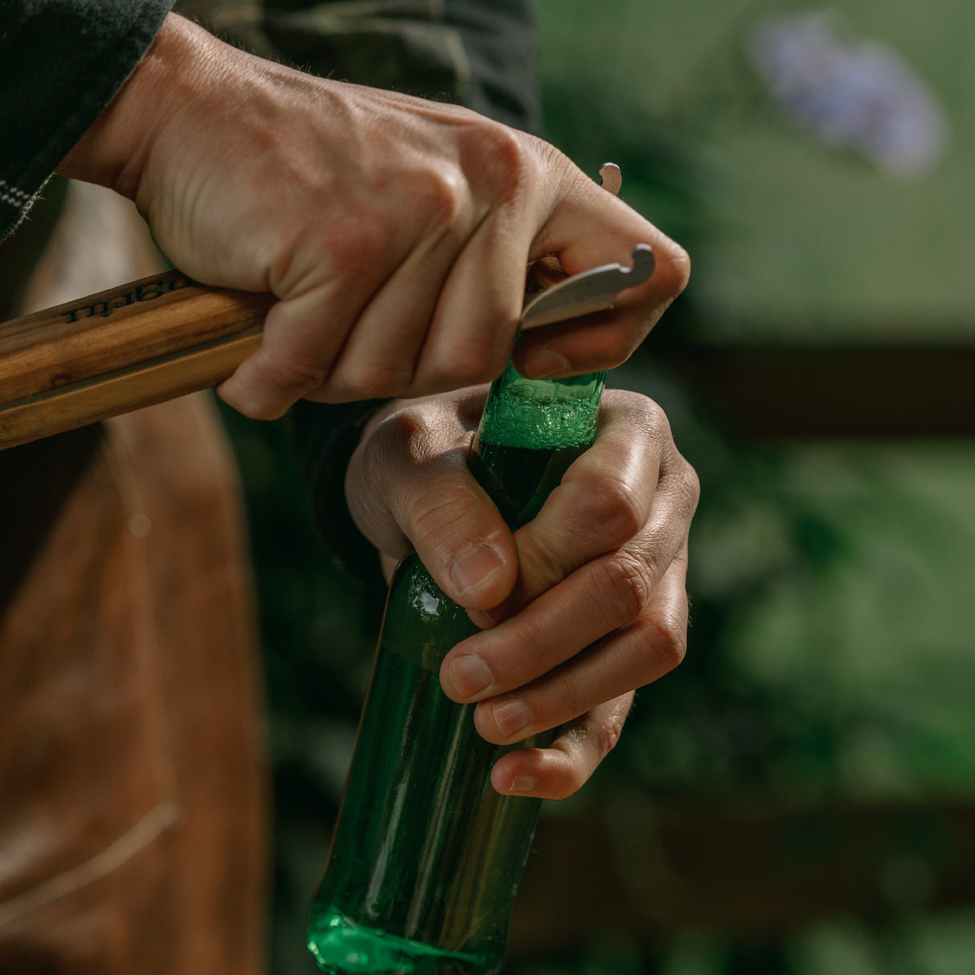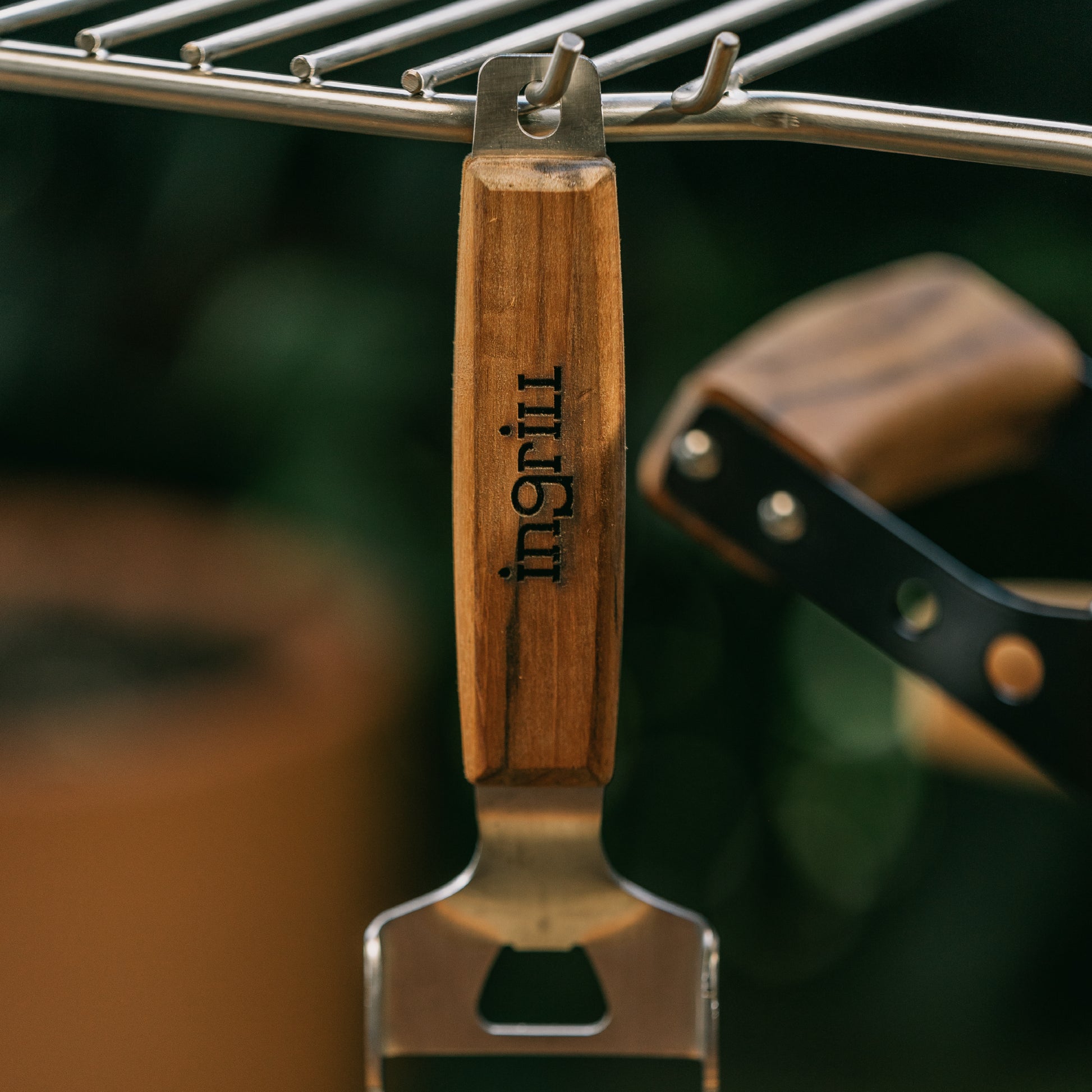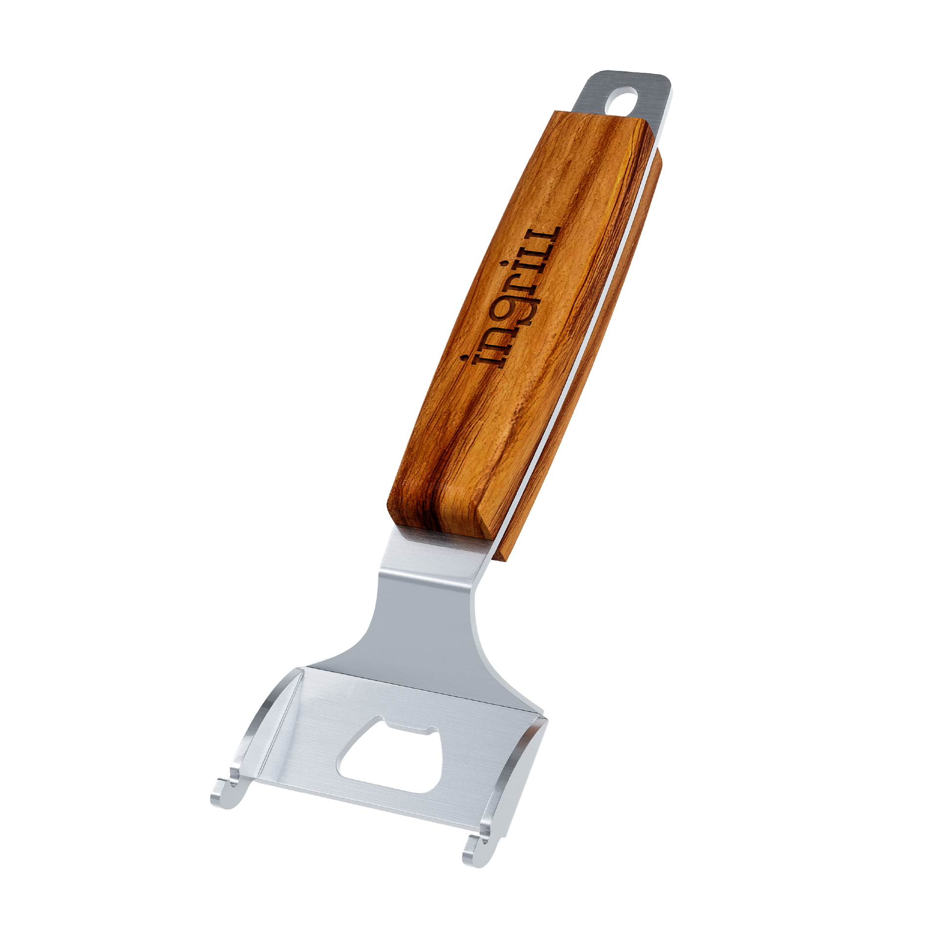 Utensilio de acero inoxidable con manija de madera de roble o teca, especial para que manipules la parrilla, te sirve también como destapador de botellas.