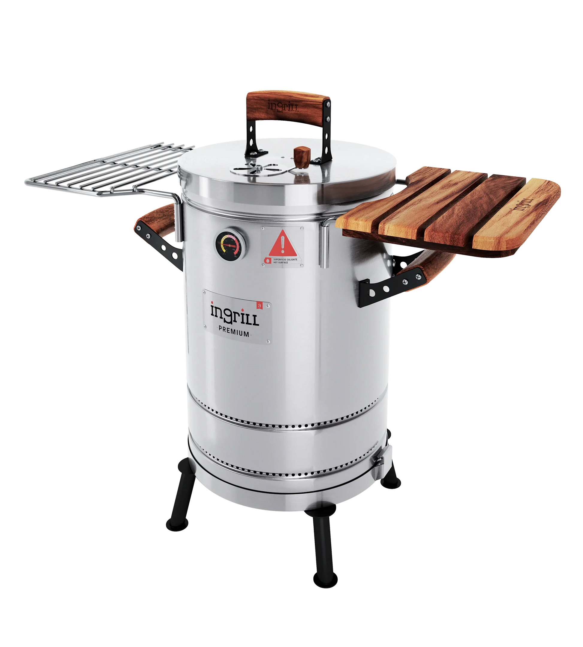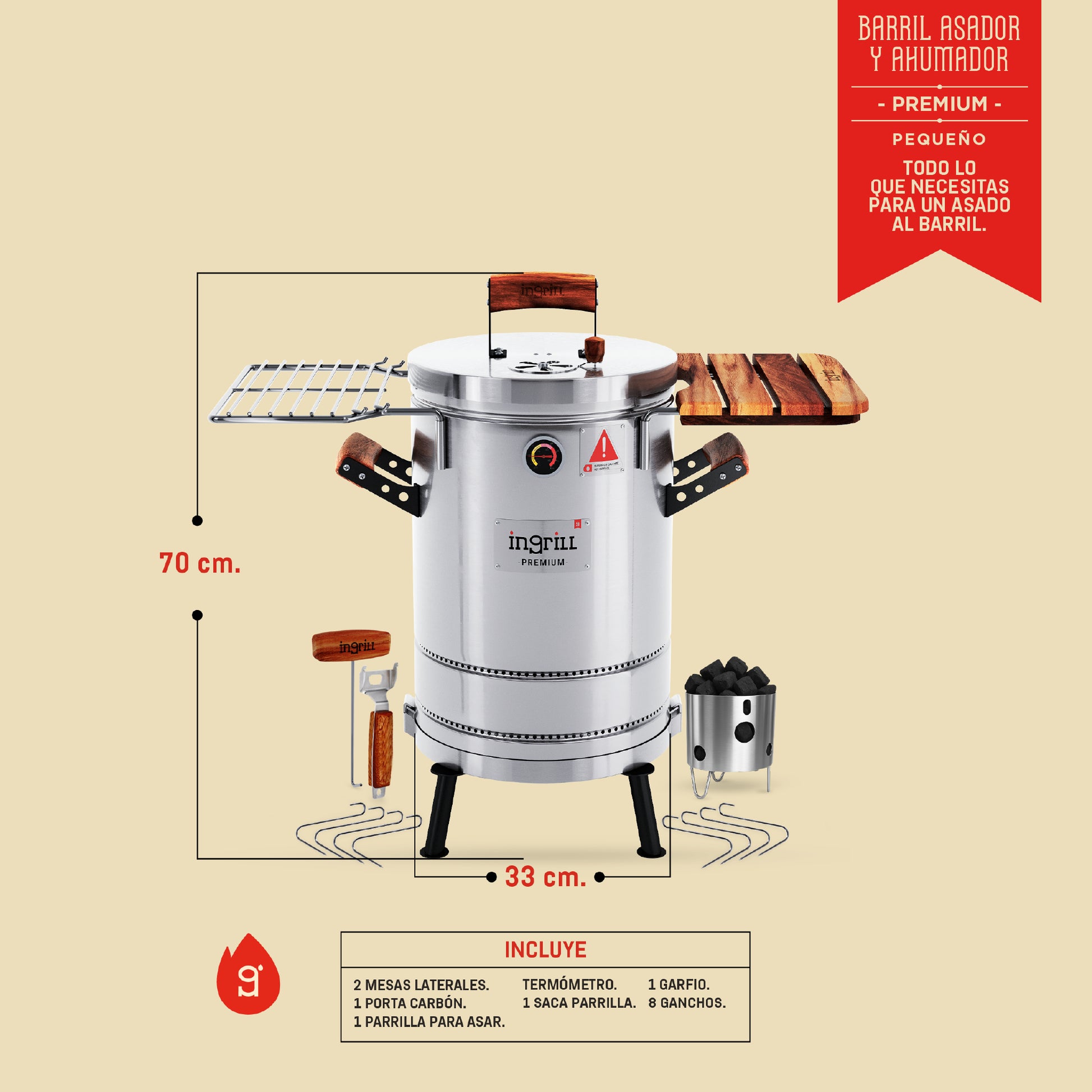 Las patas y asas de tubería y lámina cold rolled con pintura electrostática, tornillería de acero inoxidable, originales y útiles mesas laterales de apoyo de acero inoxidable y madera de TECA, cierre de cilindro por soldadura, termómetro para seguimiento de la temperatura interna, esclusa de paso de aire en la tapa, incluye kit de accesorios básicos: