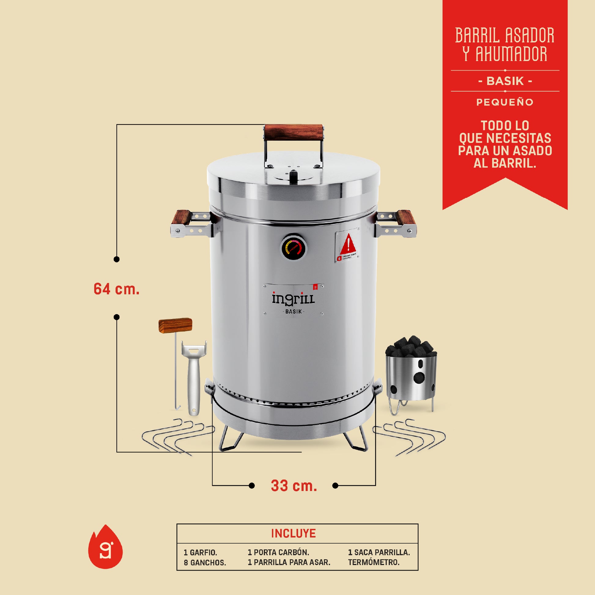 NUESTROS AHUMADORES Y ASADORES SON EQUIPOS DE COMBUSTIÓN LENTA, DESARROLLADOS PARA ASAR, AHUMAR Y HORNEAR TODO TIPO DE ALIMENTOS. GENERAN POCO HUMO, MANTENIENDO TEMPERATURAS ESTABLES CON MUY BAJO CONSUMO DE CARBÓN. FABRICADOS CON ACERO INOXIDABLE, LOS BARRILES INGRILL NO GENERAN ÓXIDOS, NI QUÍMICOS DURANTE LA COMBUSTIÓN. LAS CARNES Y OTROS ALIMENTOS QUEDAN TIERNOS, MUY JUGOSOS Y CON UN SABOR AHUMADO INCOMPARABLE.